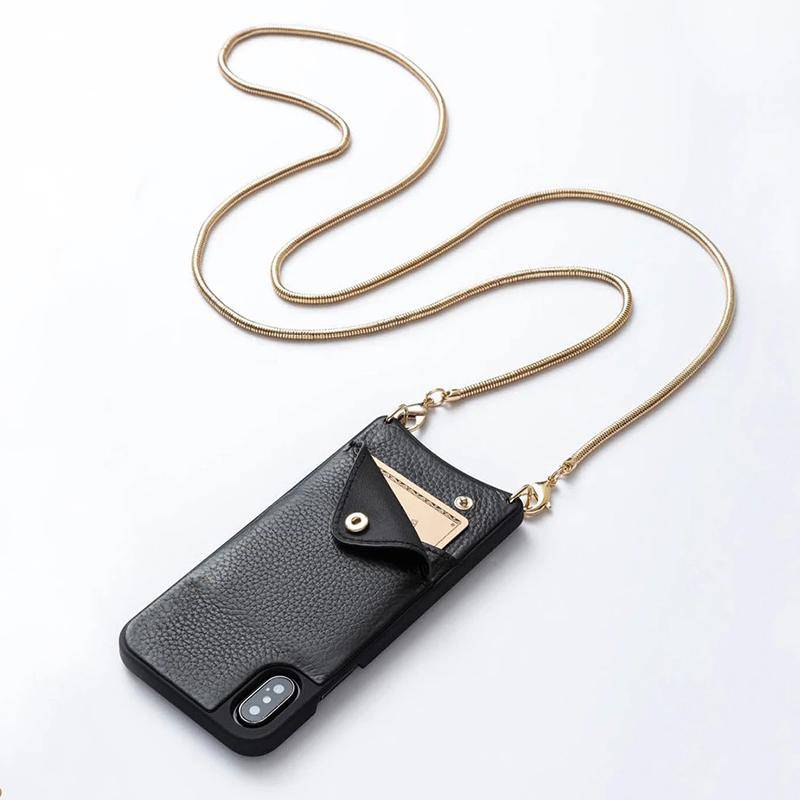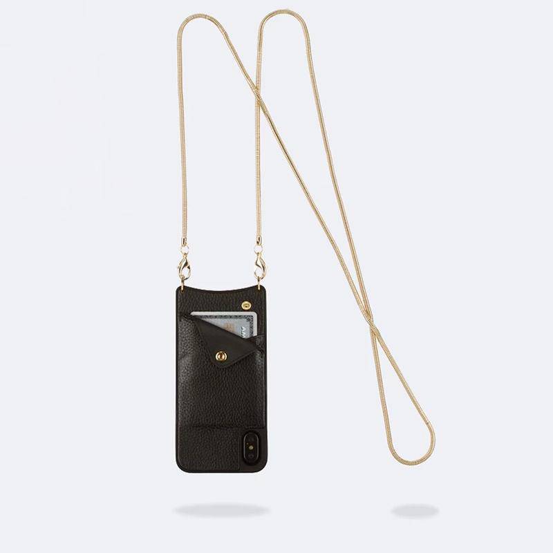 The Crossbody features a classic black leather case and gold-tone details, this is a favorite among stylists and one of the original crossbody cases. Its simple snake chain shoulder strap and hidden snapback credit card compartment make it a must-have for any on-the-go activity or high fashion lifestyle.