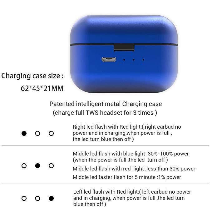 [High-end metal charging compartment with patented independent power management technology] Aluminium alloy charging compartment, This exclusive patented independent power management technology enables The charging compartment can separately control the charging of the left and right earphones separately, place the L&R earphone into the Charging Station, One Red LED indicates the earphone No power, One blue LED indicates the ear-bud charged fully, The ear-buds will charge automatically .