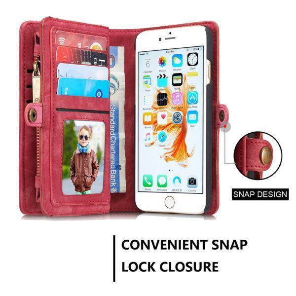 iPhone Multi-slot Zipper Wallet Folio Case Magnetic Detachable 2 in 1 Back Cover can store up to 10 credit cards including 2 ID Picture Slot, 3 pocket for cash, 1 zipper storage coins. carry around your ID, credit and debit cards, and cash without having to take your wallet with you. With a back magnetic closure design, easy to open and close, more importantly, keeps your phone more secure. small photo frame can put photo, memo cards inside, self-stand functions provide easy enjoy while reading and watching movies with your iPhone.