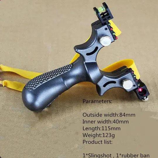Built in fiber optic sights allow you to shoot accurately from any distance. Beginners can quickly become masters. Simply turn the slingshot sideways and aim with a red or green fibre optic dot. For quicker shots simply use the laser sight attached to the handle.
