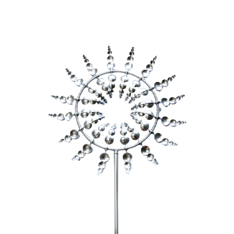 This kinetic metal wind spinner comes with ball bearing construction and a stable stake at the base, which is built to withstand all weather, sturdy and durable.