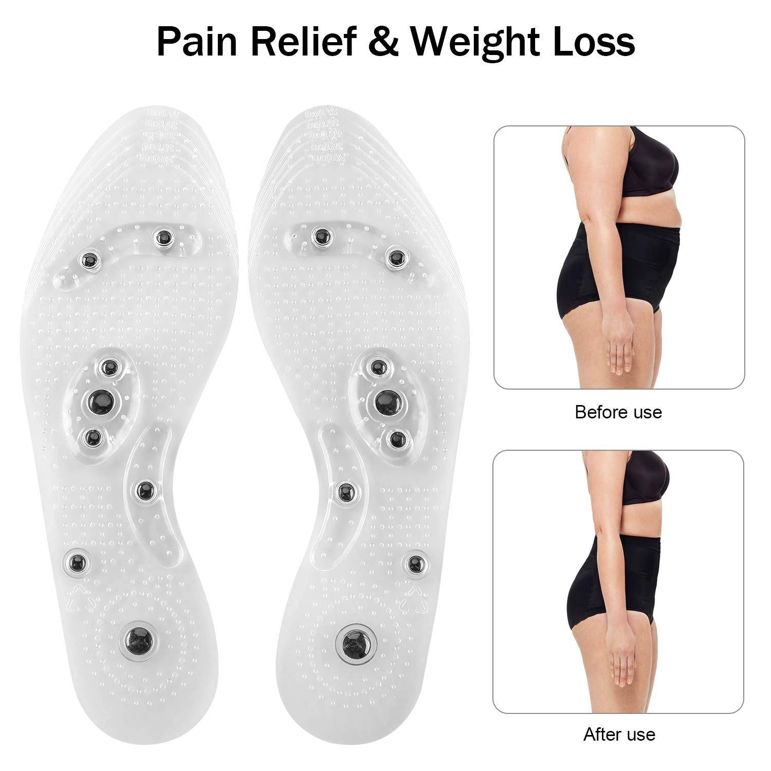 Ímãs estrategicamente posicionados e nós elevados estimulam os pontos de reflexologia, aliviando desconfortos leves a moderados nos pés e rejuvenescendo todo o corpo, além de ajudar a queimar gordura e perder peso .
