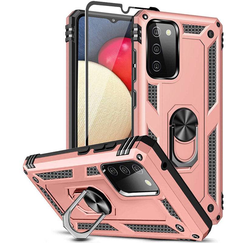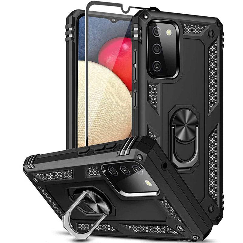 Capa de telefone com suporte de anel de armadura de luxo Samsung A02S com protetor de tela de vidro temperado de 1 pacote